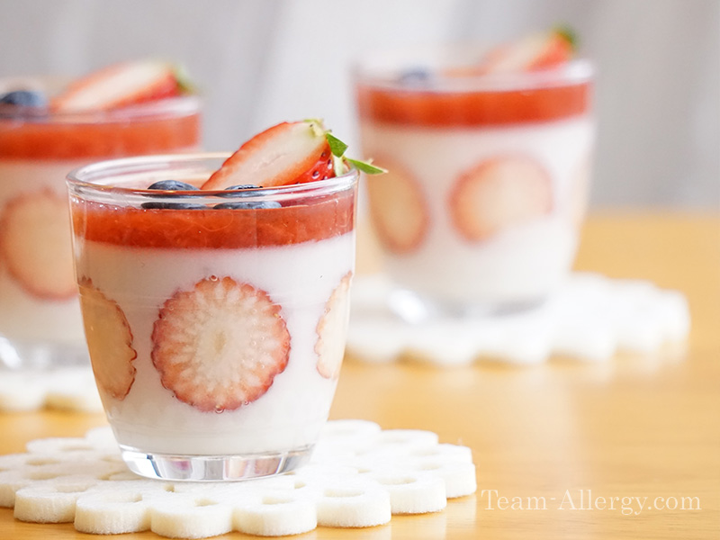 | (いちごソースを作る) いちごを半分に切り、てんさい糖とレモン汁を入れてよく混ぜてから、ラップをせずに電子レンジ500wで2分加熱する。 いったん取り出して、アクをとってから混ぜ、さらに1分加熱して冷まし、上に注ぐ。最後にイチゴとブルーベリーを飾る。 |