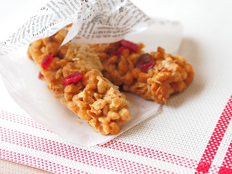 | 2 | クッキングシートで16㎝×16㎝の正方形の箱型を作り、その中に(1)を入れて何度も上からギュッと押しつけ、隙間ができないよう成形する。 150℃のオーブンで、30分程度焼く。 焼きあがったら、温かいうちにドライグランベリーを埋め込む(色鮮やかなバーにするため)。 冷蔵庫で2~3時間寝かせ、固まったら、ヨコに半分にカットし、さらにタテに4等分する。 |