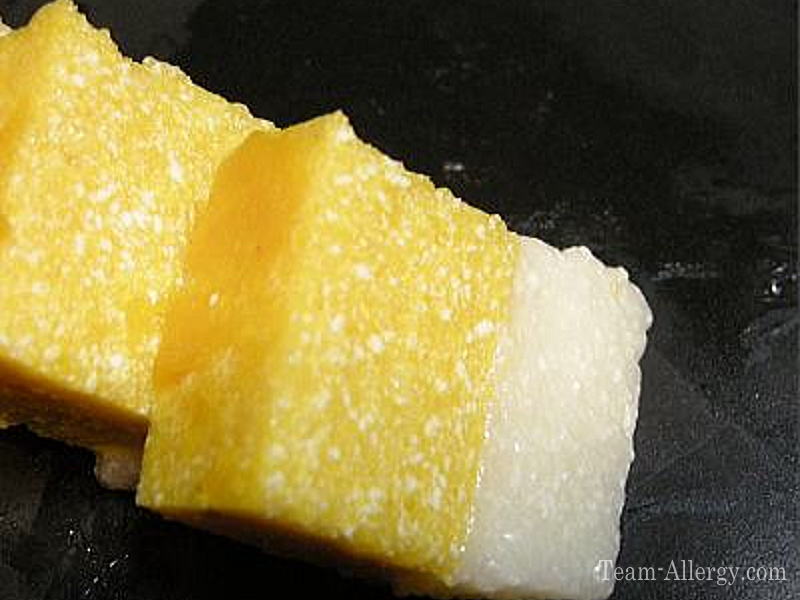 - もっちりした土台と寒天で固めた食感の違いが楽しい錦卵風仕上げ。