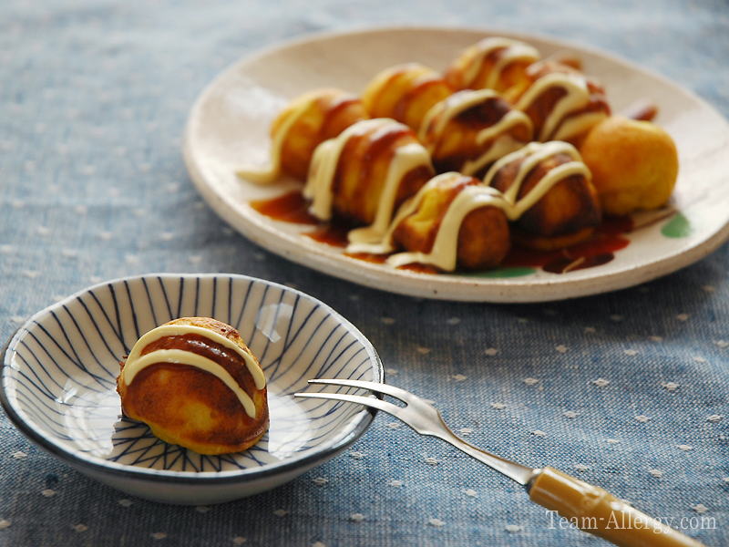 | 8 | 中まで火が通りきったら出来上がり。アレルギー用お好みソースやマヨネーズタイプドレッシングなどをかけて、熱いうちに召し上がれ。 |