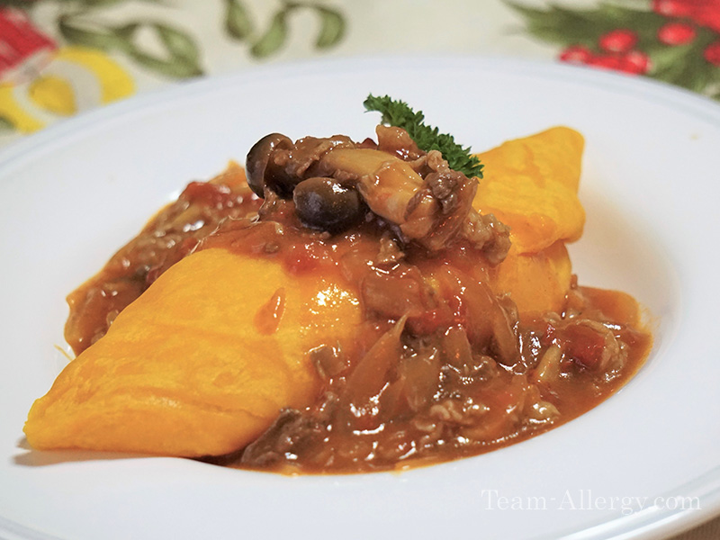 - 卵が食べられるようになったときのためにオムライスという料理に慣れておくことも大事です。卵焼き風はそのまま焼くと破れやすくて難しいので、クッキングシートで、はさみながら焼きましょう。