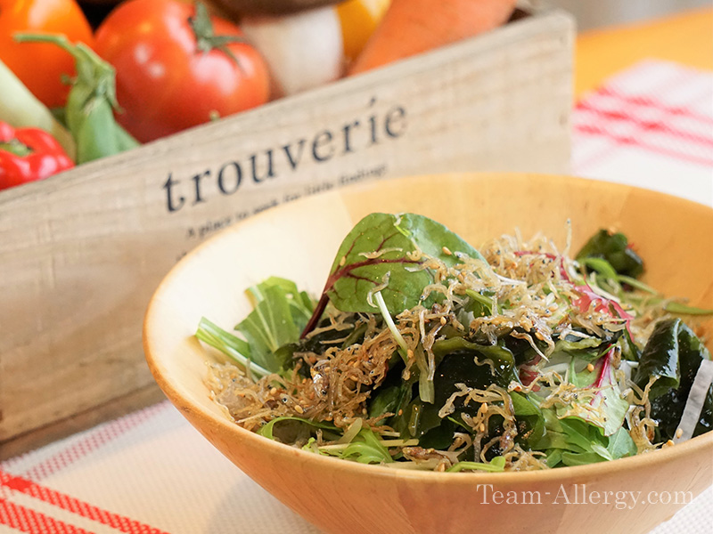 - じゃことゴマでカルシウムたっぷりのふりかけと、食物繊維豊富な海藻と野菜のサラダで、おいしく栄養補給をしましょう。