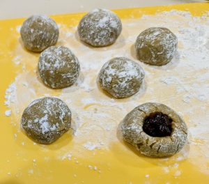⑥Aの半量の団子を4等分に分け、米粉をまぶして丸める。 |