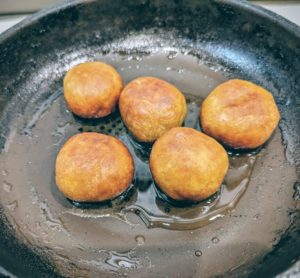 | 4 | フライパンに油を1㎝くらいまで入れて熱し、あん入り団子を入れてコロコロ転がしながら表面がカリッとしてきつね色になるまで揚げ焼きし、取り出して砂糖をまぶす。 | ![]() |